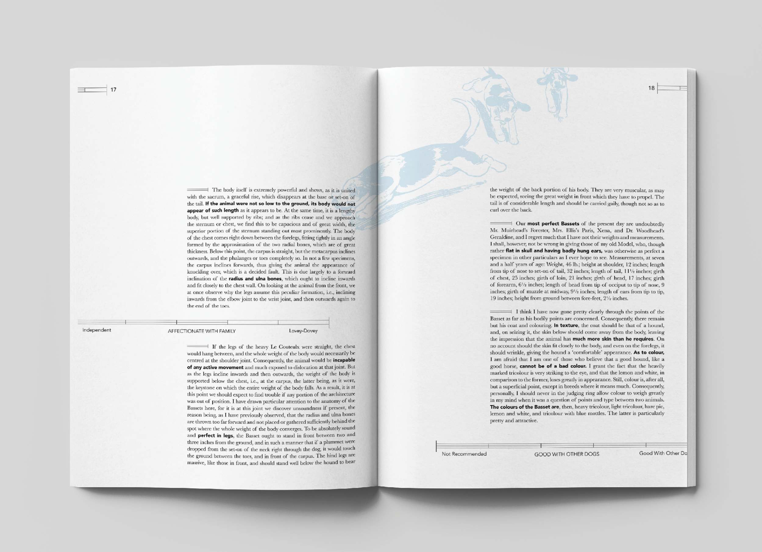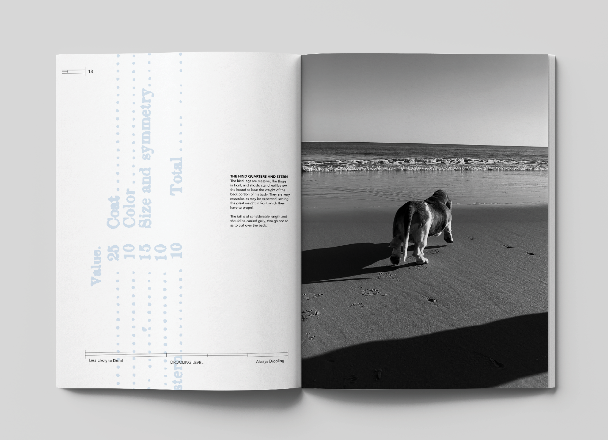 For this publication, I aimed to showcase the unique qualities of the Basset Hound, highlighting the breed’s history. The typography includes bold text to break up large blocks and emphasize key points. The book features historical photos sourced from various library archives, each paired with a description of the book from which the photo was taken. In addition to the historical images, I included portraits that I personally photographed to emphasize specific traits of the Basset Hound.